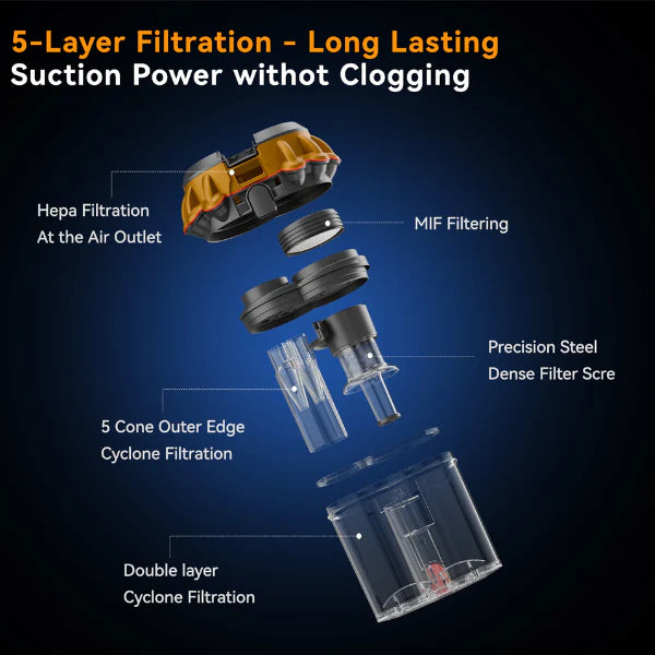 This multi-stage defense captures and traps even the most microscopic particles, preventing them from recirculating into your air. Featuring advanced HEPA filtration at the air outlet for ultra-clean exhaust, multi - cone outer edge cyclone filtration, a precision steel dense filter screen, and double-layer cyclone technology, our system ensures long-lasting, clog-free suction power. The result? A home where you can literally breathe easier.